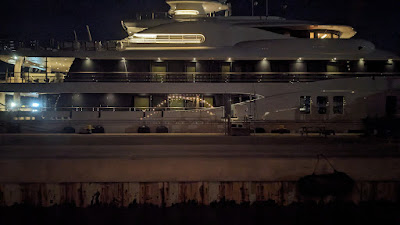 | We're dwarfed by our neighbor, the 242' motor yacht Synthesis. If you want a ride, she's for charter for $940,000 per week. Plus expenses. That does include all 18 crew, though. |