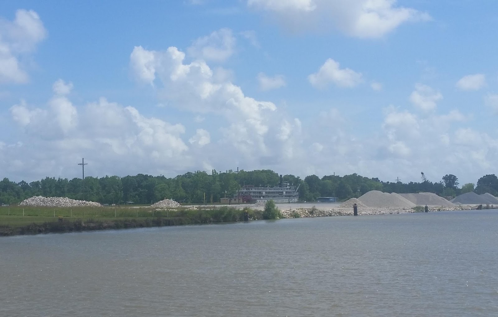 Our chart showed one marina there, but it is long defunct and there is nothing left of it. With no place to either anchor or tie up, we continued west to Houma. This part of the route is predominantly wetland until the outskirts of Houma, which owes its existence entirely to maritime service facilities and shipyards. On our way into port we passed the steam paddlewheeler Delta Queen, which was towed here from Chattanooga along more or less our same route a year or so ago, and now sits idle in a shipyard awaiting its fate.