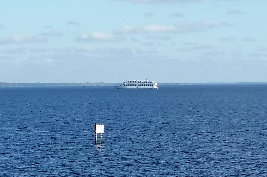 The cruise upriver was pleasant and interesting. We passed a Carnival cruise ship in port; here in Jacksonville the cruise terminal is a long way from town. We also passed the Independence, of American Cruise Lines, docked at a repair yard with her sister ship, American Star. We had just seen the Independence a week ago in Charleston, so she just came out of service. I had to chat with the crews, as they were planning to jockey them around just after we passed.