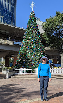 | Louise poses with the holiday tree in Johnson Park, about the only feature of Jacksonville Landing, its former holiday location, that we miss. |